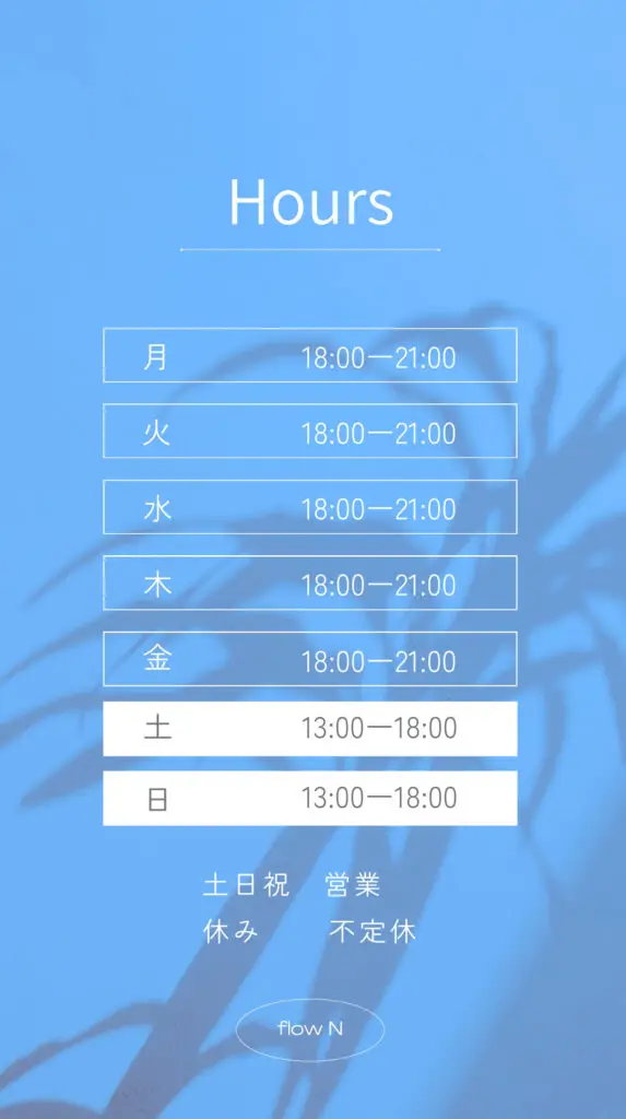 Concept こころ heart からだ body たましい spirit 3つのバランスを調和するflow N“flow=流れ”を意味する言葉“N”は、natureのN私たちは、flow(流れ)の中で生きています流れに逆らわず…『ありのままの自分に還る』時間と空間を目指しています About Me はじめましてセラピストの中野治佳です 福岡で十年ほどサロンを営み、2025年春に、長崎の地に移住しました自然豊かな暮らしの中で「一人ひとりに寄り添えるサロンを作りたい」想いが芽生えflowNをスタートしました どうぞよろしくお願いいたします Contact ご予約・お問合せは、公式LINE “ flow N ” よりご連絡下さい ここをクリック Hours スケジュールの確定は、各日曜日に更新されます。 先着順で予約を受け付けています。状況により、仮予約されている日が予約できない場合がございます。あらかじめ、ご了承ください。確定・未確定に関わらず、週はじめの日曜日にご連絡を差し上げます。希望に添えない場合は、別日のご提案をいたします。 予約の際は、第1希望~第3希望日時をお知らせください。 ○ = 確定 △ = 未確定 Access 〒859-0406長崎県諫早市多良見町木床890-6 駐車場 4台完備 JR長崎本線 喜々津駅より徒歩14分